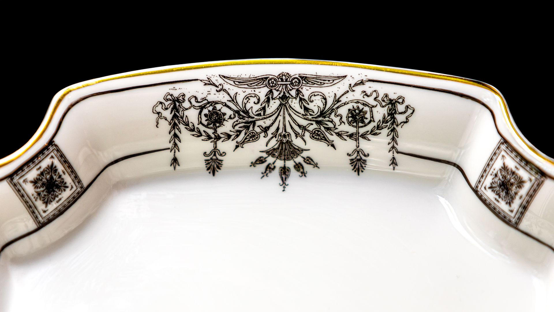 A clean black and white, geometric pattern referring to the antique world characterizes this collection, which is also great for practical use in modern homes.