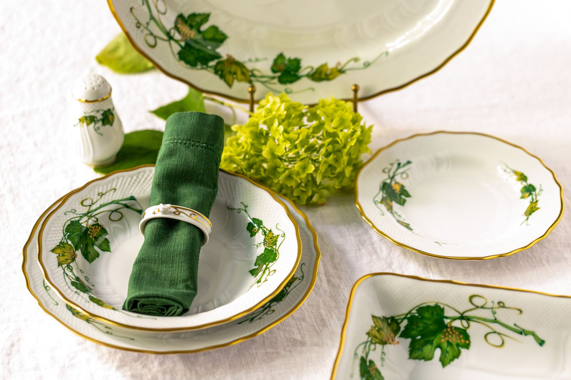 Tokaj aranyszínű borai a közeli hollóházi mestereket is megihlették. Az Arany Tokaj kollekció a 21 karátos, kézi aranyozású klasszikus porcelánformák szép darabja. A készletben hagyományos színeink, a szőlőtőke zöldje és az aszú óaranyszíne köszönnek vissza. Szőlőleveles motívuma alkalmi hangulatot sugároz. Különösen ajánljuk a boros témák kedvelői számára, valamint díszes megjelenésének köszönhetően az ünnepi asztalnak is emeli a fényét.