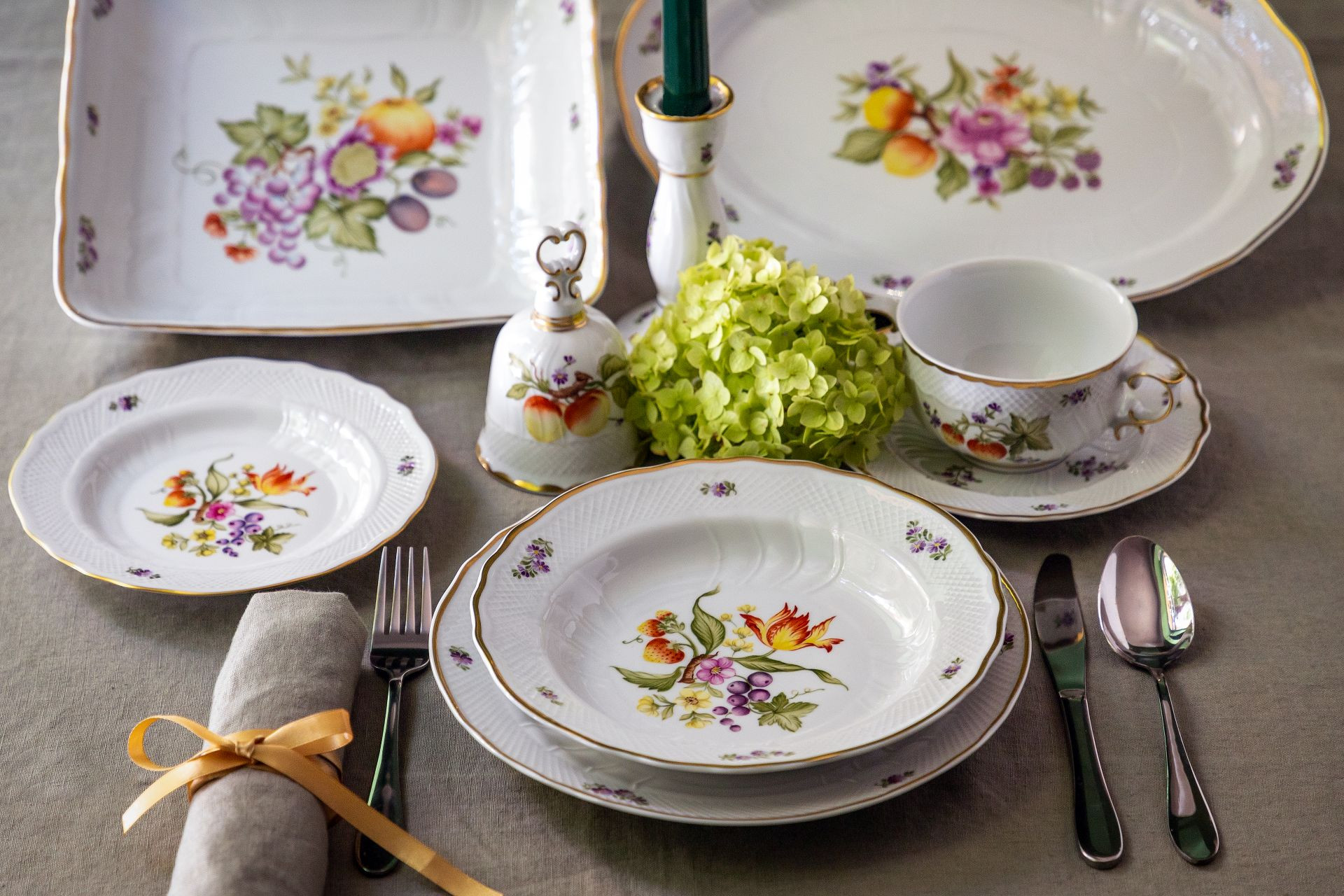 A Sophie kollekció különleges, részletgazdag díszítésével a Hollóházi Porcelánmanufaktúra ékköve. A teljes egészében kézi festésű és 21 karátos aranyozású minták csodálatos harmóniában és élénk színvilággal jelennek meg a csillogó fehér porcelánon. Változatos virág- és epermotívumaival egy romantikus, virágillatú nyári kert hangulatát varázsolja asztalunkra. A Sophie kollekció különösen értékes, míves, kézi díszítése miatt leinkább ünnepi alkalmakhoz illik.