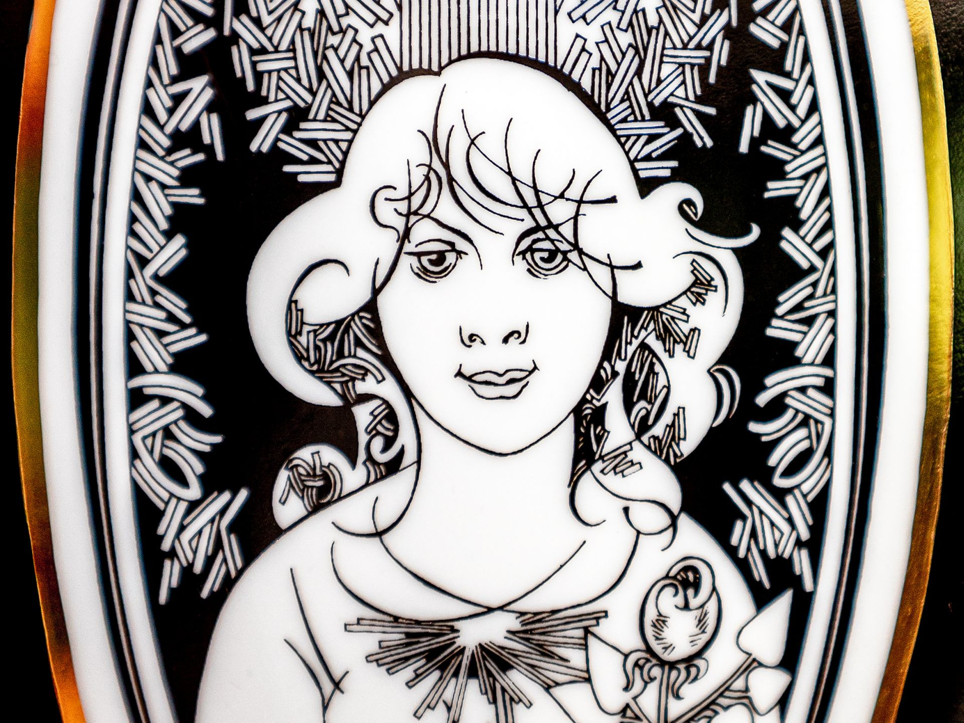 This romantic decoration depicting a charming female figure was created based on the graphics designed by László Jurcsák, the former head of Endre Szász’s art department.