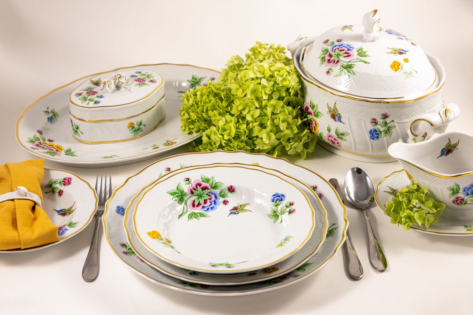 A Hortenzia jellegzetes és közkedvelt díszítése a hollóházi porcelánoknak. Kék, rózsaszín, sárga és zöld tónusú élénk virágmotívumai, színpompás pillangói és természetesen a kézzel festett 21 karátos aranycsíkozás valódi romantikus hangulatot teremtenek. Elsősorban ünnepi alkalmakra javasoljuk, de bátran elő lehet venni egy esős hétköznapon is.
