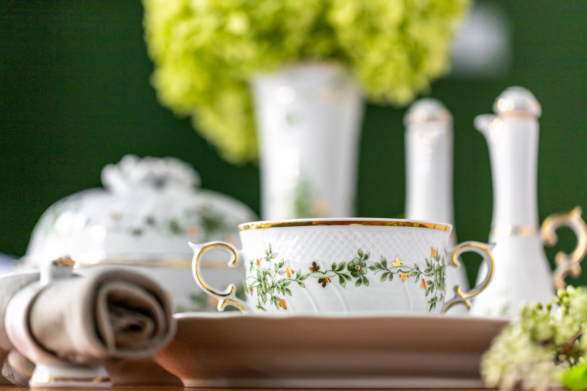 Erika a Classic család legismertebb és legkedveltebb díszítése zöld tónusú, apró virágmintákkal és 21 karátos, kézzel festett arany kiegészítésekkel. Ez a kedves minta annyira belopta magát az emberek szívébe, hogy újabb és újabb híveket szerez magának és a porcelán nemes világának. Ideális teríték az ünnepi asztalon vagy akár a hétvégi családi ebédeken.
